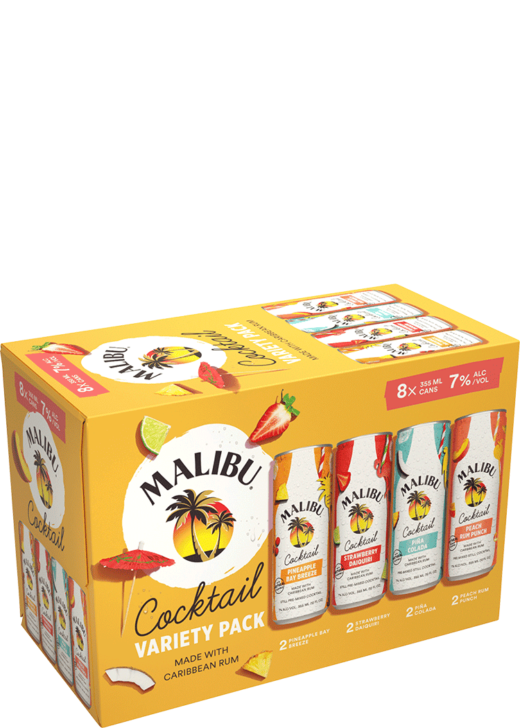 Barbados – 7% – Conveniently sip the flavors of summer with Malibu Ready to drink Cocktails, made with real Malibu Caribbean Rum. Each variety pack includes 2 – 12 oz cans of Pina Colada, Strawberry Daiquiri, Peach Rum Punch & Pineapple Bay Breeze.