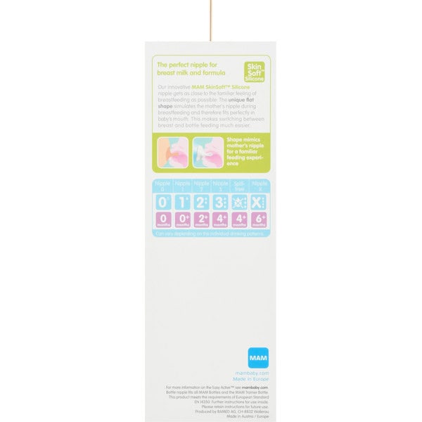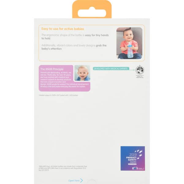 Ergonomic shape – easy for tiny hands to hold. Flat, soft nipple – like mom’s breast when breastfeeding. Easy to hold baby bottle. Easy to use for active babies. The ergonomic shape of the bottles is easy for tiny hands to hold. Additionally, vibrant colors and lovely designs grab the baby’s attention. The MAM Principle: Parents are demanding. At MAM, we are too. That’s why, for over 40 years, we have worked with medical and research experts to develop products that are unique in function and design. MAM products support the individual development of every child and make everyday life easier for babies. Developed with medical experts. The perfect nipple for breast milk and formula. Skin soft silicone. Our innovative MAM SkinSoft Silicone nipple gets as close to the familiar feeling of breastfeeding as possible: The unique flat shape simulates the mother’s nipple during breastfeeding and therefore fits perfectly in baby’s mouth. This makes switching between breast and bottle feeding much easier. Shape mimics mother’s nipple for a familiar feeding experience. Bottle nipple fits all MAM Bottles and the MAM Trainer Bottle. Further instructions for use inside. Please retain for future use. Nipple: Flat, soft nipple – like mom’s breast when breastfeeding. 94% (Market research 2009-2017, tested with 1,508 babies). 94% Nipple acceptance (Market research 2009-2017, tested with 1,508 babies). For active babies. Easy to hold independently. Modern & playful motifs. Convenience: Easy filling. Fast cleaning. BPA BPS free. All MAM products are made from materials free of BPA and BPS (BPA free in accordance with regulation (EU) No. 321/2011). International Children Medical Research Society. Scientific Panel of BAMED AG. www.icmrs.org.