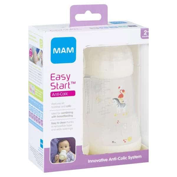 Innovative anti-colic system. Reduces air bubbles and colic. Ideal for combining with breastfeeding. Easy to clean thanks to removable base and wide openings. 100% baby safe. 3 min. self-sterilizing. Smooth flow thanks to innovative anti-colic system. The valve in the base of the bottle prevents the formation of air bubbles and stops the liquid from foaming. This creates a smooth flow and prevents baby from swallowing air while drinking. The result is less colic and a relaxed baby (Clinical Study: Argentina, 2012 n=34). The Mam Principle: Parents are demanding. At MAM, we are too. That’s why, for over 40 years, we have worked with medical and research experts develop products that are unique in function and design. Mam products support the individual development of every child and make everyday life easier for babies. Clinically Proven: A study conducted with preterm infants confirms that the MAM Easy Start provides authentic feeding and relaxed drinking. Self-Sterilizing in 3 Minutes: With our unique self-sterilizing function – ideal for on the go. Ensures simple, safe bottle cleaning in the microwave. Fill in 1 fl oz of water. Heat for 3 min. in the microwave (500-1000 watts). Our self-sterilizing function saves up to 85% (Global product Carbon Footprint study, Austria 2013, conducted by denkstatt) of energy & Co2. The perfect nipple for breast milk and formula. Skin soft silicone. 94% nipple acceptance (Market research 2009-2017, tested with 1,508 babies). Our innovative MAM SkinSoft Silicone nipple gets as close to the familiar feeling of breastfeeding as possible: The unique flat shape simulates the mother’s nippe during breastfeeding and therefore fits perfectly in baby’s mouth. This makes switching between breast and bottle feeding much easier. Shape mimics mother’s nipple for a familiar feeding experience. Nipple: Flat, soft nipple – like mom’s breast when breastfeeding. 94% (Market research 2009-2017, tested with 1,508 babies) accept our bottle without problems. Breastfeeding: Ideal for combining with breastfeeding. Developed to feel like breastfeeding. Anti-Colic: Reduces air bubbles and colic; Allows babies to drink at their own pace; Smooth flow thanks to innovative anti-colic system. Less colic confirmed by 80% of mothers (Field study, Austria 2011, tested with 73 mothers of colicky babies/Market research, USA 2010, tested with 35 mothers of colicky babies). This product meets the requirements of European Standard EN 14350. mambaby.com. For more information on the Easy Start see mambaby.com. Developed with medical experts. International Children Medical Research Society: Scientific Panel of BAMED AG. www.icmra.org. BPA (BPA/BPS free: Al MAM bottles are made from materials free of BPA and BPS (BPA free in accordance with regulation (EU) No. 321/2011)) BPS free. Made in Europe. Made in Austria/Europe.