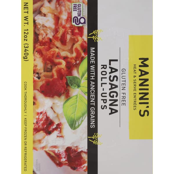 Ready in minutes! Gluten free. Certified gluten-free. Delicious & fresh. Heat & serve meals. Manini’s Heat & Serve Lasagna Roll-Ups are naturally gluten free pasta sheets made from our proprietary ancient grains flour. With delicious cheese and savory marinara sauce, this new twist on the traditional Italian favorite provides a satisfying meal in a hurry. 100% Whole Grain: 16 g or more per serving. Eat 48 g or more of whole grains daily. WholeGrainsCouncil.org. mannis.com. Made in the USA.