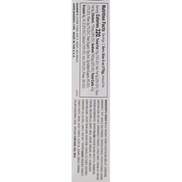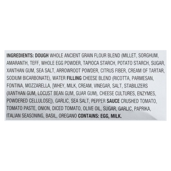 Pasta: Manini’s Flour Blend (whole Millet Flour, Tapioca Flour, Teff Flour, Organic Sorghum Flour, Organic Amaranth Flour), Powdered Eggs, Sauce: Water, Tomatoes, Onions, Olive Oil, Non-gmo Sugar, Garlic, Sea Salt, Basil, Oregano, Thyme, Rosemary, Bay Leaf, Red & Black Pepper, Filling: Ricotta Cheese, Eggs, Parmesan Cheese, Romano Cheese, Sea Salt, Black Pepper, Parsley