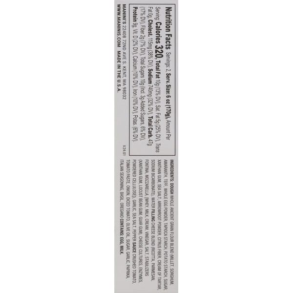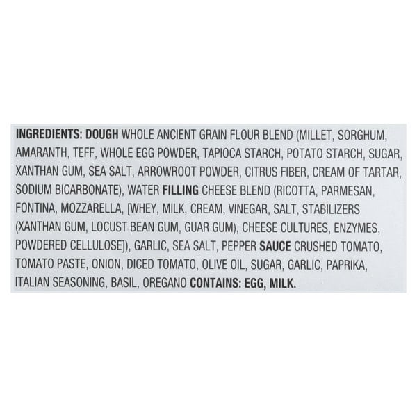Dough Whole Ancient Grain Flour Blend (Millet, Sorghum, Amaranth, Teff, Whole Egg Powder, Tapioca Starch, Potato Starch, Sugar, Xanthan Gum, Sea Salt, Arrowroot Powder, Citrus Fiber, Cream of Tartar, Sodium Bicarbonate), Water Filling Cheese Blend (Ricotta, Parmesan, Fontina, Mozzarella, [Whey, Milk, Cream, Vinegar, Salt, Stabilizers (Xanthan Gum, Locust Bean Gum, Guar Gum), Cheese Cultures, Enzymes, Powdered Cellulose]), Garlic, Sea Salt, Pepper Sauce Crushed Tomato, Tomato Paste, Onion, Diced Tomato, Olive Oil, Sugar, Garlic, Paprika, Italian Seasoning, Basil, Oregano.