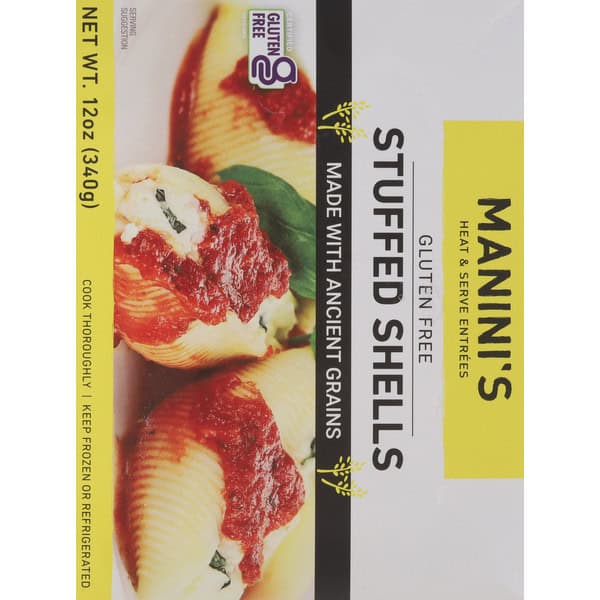 Ready in minutes! Certified gluten-free. Heat & serve meals. Delicious & fresh. Manini’s Heat & Serve Stuffed Shells are made exclusively from our proprietary Ancient Grains flour and filled with a rich cheese blend. Topped with a savory marinara sauce, this al dente gluten free dish will be a household favorite in no time at all. 100% Whole Grain: 16 g or more per serving. Eat 48 g or more of whole grains daily. WholeGrainsCouncil.org. mannis.com. Made in the USA.