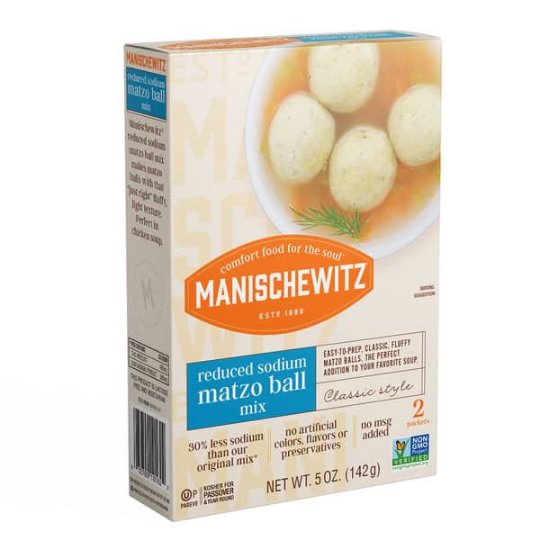 Quality since 1888. Kosher for passover and all year round. 30% less sodium than our original mix (Per Serving: This Product: 420 mg sodium; Our Original Product: 600 mg sodium). L’Chaim! To life! All natural. 0 g trans fat per serving. No MSG. Healthy body. Healthy spirit. This product is sold by weight not by volume. For great recipes and more visit www.manischewitz.com. Printed on recycled paperboard. Matzo Balls are a delicious treat that taste great in chicken soup or as a side dish. Enjoy all of our matzo ball, and matzo ball & soup products throughout the year. For great recipes, product information and more, log on to: www.manischewitz.com. www.manischewitz.com. This product is lactose free and vegetarian. Product of USA.