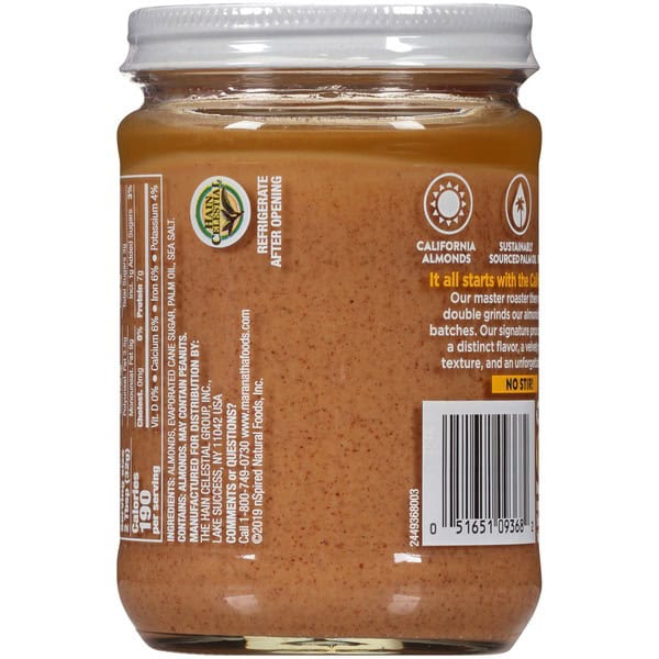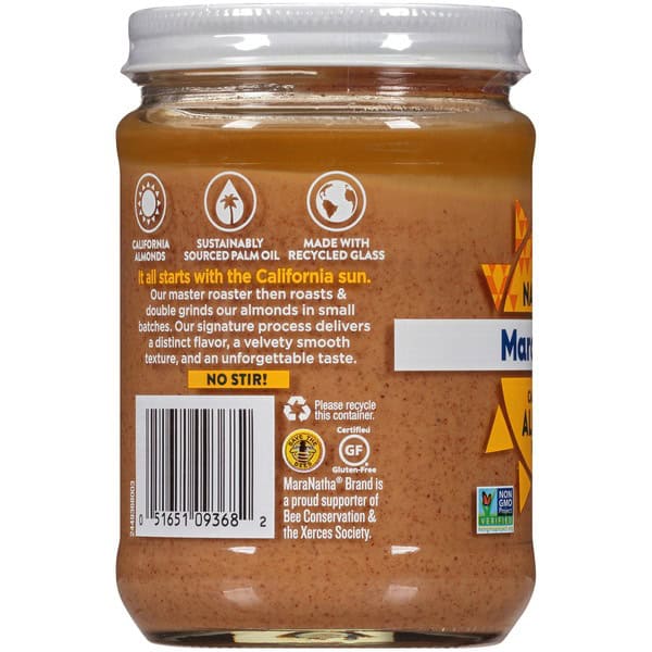 Non GMO Project verified. Nongmoproject.org. Comments or Questions? Call 1-800-749-0730. www.maranathafoods.com. Hain Celestial. Small batch roasted. California almonds. Sustainably sourced palm oil. It all starts with the California sun. Our master roaster then double grinds our almonds for a distinct flavor and velvety texture & hand-crafts in small batches for the highest quality and an unforgettable taste. No stir. Please recycle this container. Save the bees. Gluten free. MaraNatha Brand is a proud supporter of Bee Conservation & the Xerces Society.