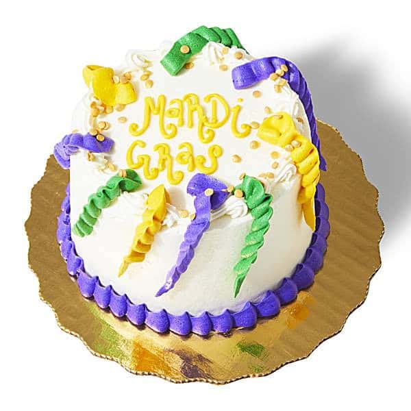 Four layers of 5-in. vanilla or chocolate cake filled and iced in buttercream icing. Perfect for Mardi Gras celebration.