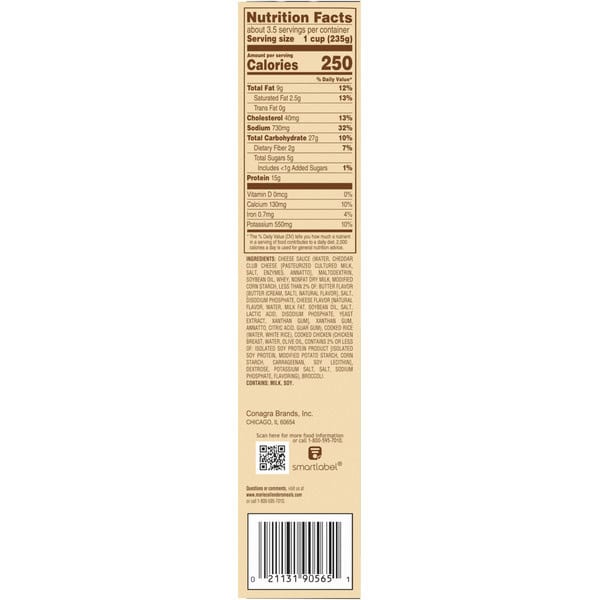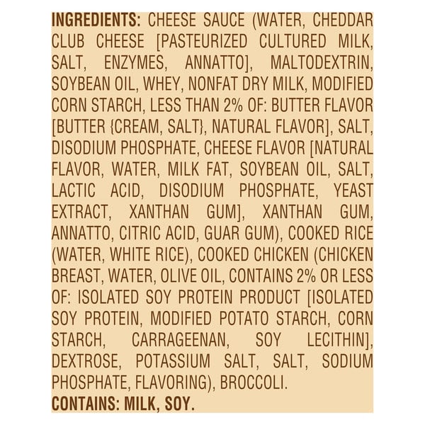 Cheese Sauce (water, Cheddar Club Cheese [pasteurized Cultured Milk, Salt, Enzymes, Annatto], Maltodextrin, Soybean Oil, Whey, Nonfat Dry Milk, Modified Corn Starch, Less Than 2% Of: Butter Flavor [butter {cream, Salt}, Natural Flavor], Salt, Disodium Phosphate, Cheese Flavor [natural Flavor, Water, Milk Fat, Soybean Oil, Salt, Lactic Acid, Disodium Phosphate, Yeast Extract, Xanthan Gum], Xanthan Gum, Annatto, Citric Acid, Guar Gum), Cooked Rice (water, White Rice), Cooked Chicken (chicken Breast, Water, Olive Oil, Contains 2% Or Less Of: Isolated Soy Protein Product [isolated Soy Protein, Modified Potato Starch, Corn Starch, Carrageenan, Soy Lecithin], Dextrose, Potassium Salt, Salt, Sodium Phosphate, Flavoring), Broccoli.