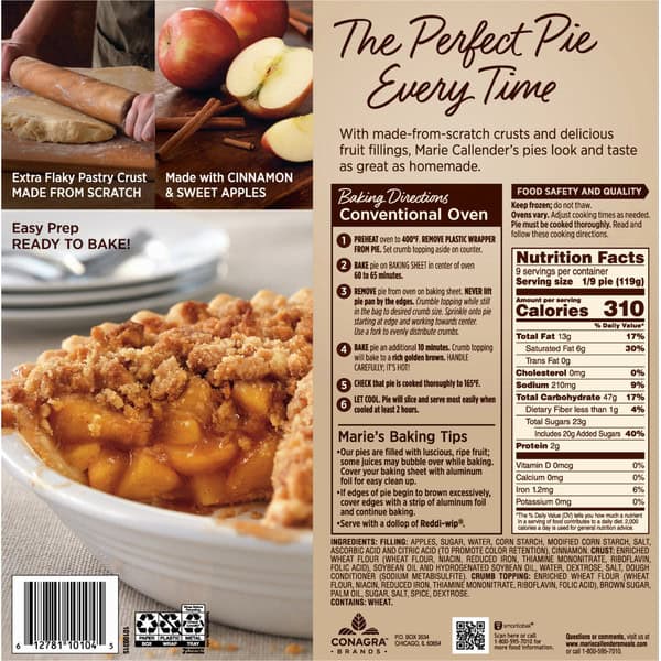 Baking Directions: Conventional Oven: 1. Preheat oven to 400 degrees F. Remove plastic wrapper from pie. Set crumb topping aside on counter. 2. Bake pie on baking sheet in center of oven 60 to 65 minutes. 3. Remove pie from oven on baking sheet. Never lift pie pan by the edges. Crumble topping while still in the bag to desired crumb size. Sprinkle onto pie starting at edge and working towards center. Use a fork to evenly distribute crumbs. 4. Bake pie an additional 10 minutes. Crumb topping will bake to a rich golden brown. Handle carefully; it’s hot! 5. Check that pie is cooked thoroughly to 165 degrees F. 6. Let cool. Pie will slice and serve most easily when cooled at least 2 hours. Marie’s Baking Tips: Our pies are filled with luscious, ripe fruit; some juices may bubble over while baking. Cover your baking sheet with aluminum foil for easy clean up. If edges of pie begin to brown excessively, cover edges with a strip of aluminum foil and continue baking. Serve with a dollop of Reddi-wip. Food Safety and Quality: Keep frozen; do not thaw. Ovens vary. Adjust cooking times as needed. Pie must be cooked thoroughly. Read and follow these cooking directions.