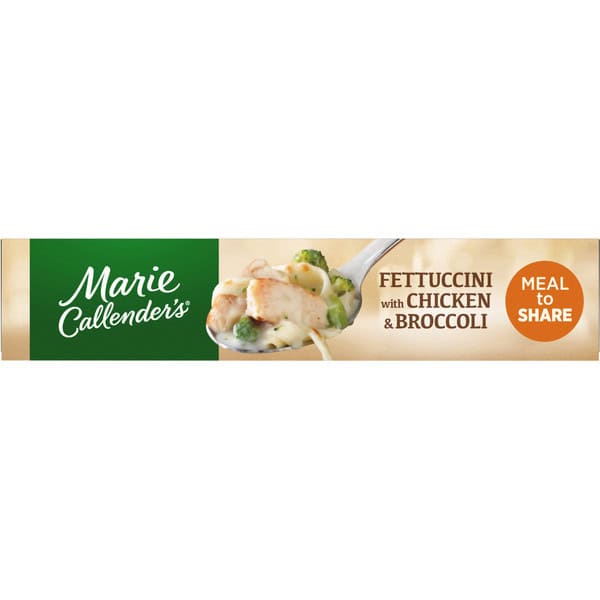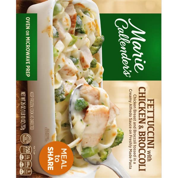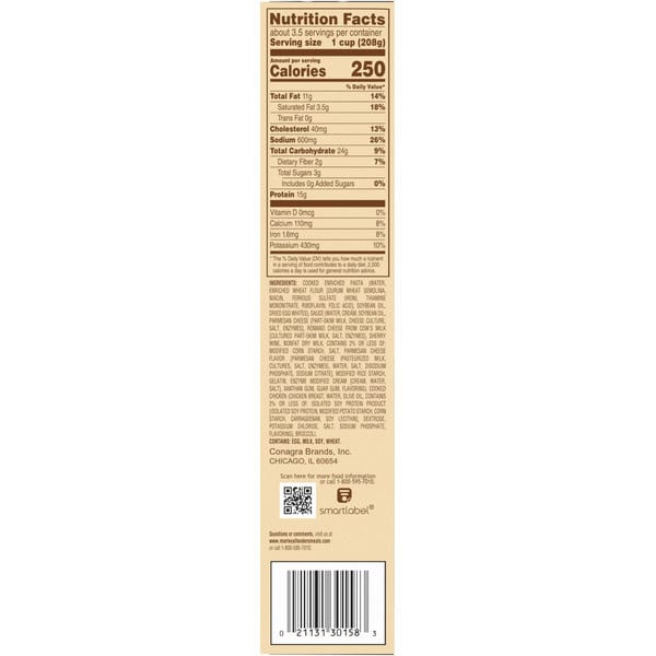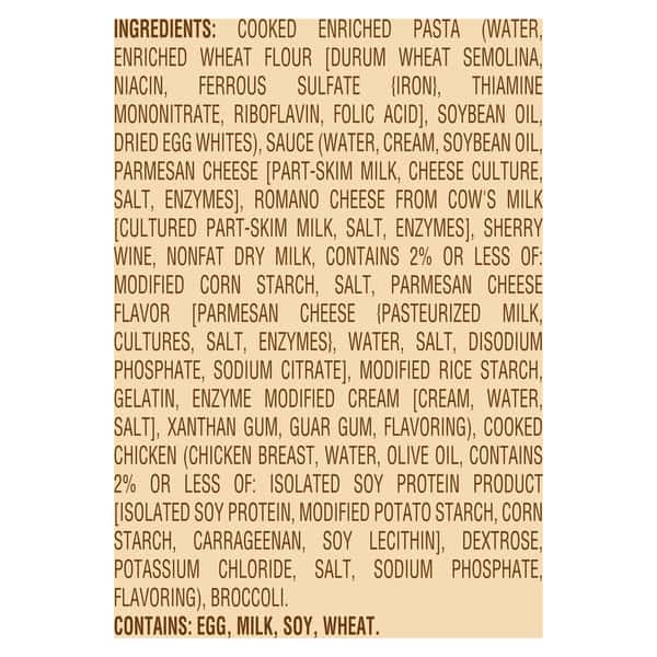 Cooked Enriched Pasta (water, Enriched Wheat Flour [durum Wheat Semolina, Niacin, Ferrous Ferrous Sulfate {iron}, Thiamine Mononitrate, Riboflavin, Folic Acid], Soybean Oil, Dried Egg Whites), Sauce (water, Cream, Soybean Oil, Parmesan Cheese [part-skim Milk, Cheese Culture, Salt, Enzymes], Romano Cheese From Cow’s Milk [cultured Part-skim Milk, Salt, Enzymes], Sherry Wine, Nonfat Dry Milk, Contains 2% Or Less Of: Modified Corn Starch, Salt, Parmesan Cheese Flavor [parmesan Cheese (pasteurized Milk, Cultures, Salt, Enzymes), Water, Salt, Disodium Phosphate, Sodium Citrate], Modified Rice Starch, Gelatin, Enzyme Modified Cream [cream, Water, Salt], Xanthan Gum, Guar Gum, Flavoring), Cooked Chicken (chicken Breast, Water, Olive Oil, Contains 2% Or Less Of: Isolated Soy Protein Product [isolated Soy Protein, Modified Potato Starch, Corn Starch, Carrageenan, Soy Lecithin], Dextrose, Potassium Chloride, Salt, Sodium Phosphate, Flavoring), Broccoli.