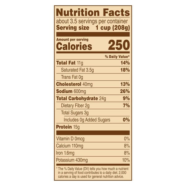 Microwave Oven: Cook only one at a time. 1. Peel back corner of film to vent. 2. Cook on high 10 minutes. 3. Stir meal; re-cover. 4. Cook an additional 3 to 5 minutes. 5. Check that food is cooked thoroughly. Careful, it’s hot! Let stand 5 minutes; enjoy! Conventional Oven: Do not prepare in toaster oven. 1. Preheat oven to 375 degrees F. 2. Peel back corner of film to vent. 3. Cook on baking sheet in center of oven 55 to 60 minutes. 4. Check that food is cooked thoroughly. Careful, It’s Hot! Let stand 5 minutes; stir and enjoy! Tray designed for single use only. Do not re-use. For Food Safety and Quality: Keep frozen. Do not thaw. Microwave directions developed with 1100-watt microwave ovens. Appliances vary. Adjust cooking times as needed. Food must be cooked thoroughly to 165 degrees F.