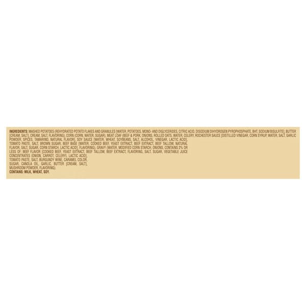 Mashed Potatoes (rehydrated Potato Flakes And Granules [water, Potatoes, Mono-and Diglycerides, Citric Acid, Disodium Dihydrogen Pyrophosphate, Bht, Sodium Bisulfite], Butter [cream, Salt], Cream, Salt, Flavoring), Corn (corn, Water, Sugar), Meat Loaf (beef & Pork, Onions, Rolled Oats, Water, Celery, Rochester Sauce [distilled Vinegar, Corn Syrup, Water, Salt, Garlic Powder, Spices, Tamarind, Natural Flavor], Soy Sauce [water, Wheat, Soybeans, Salt, Alcohol, Vinegar, Lactic Acid], Tomato Paste, Salt, Brown Sugar, Beef Base [water, Cooked Beef, Yeast Extract, Beef Extract, Beef Tallow, Natural Flavor, Salt, Sugar, Corn Starch, Lactic Acid], Flavoring), Gravy (water, Modified Corn Starch, Onions, Contains 2% Or Less Of: Beef Flavor [cooked Beef, Yeast Extract, Beef Tallow, Beef Extract, Flavoring, Salt, Sugar, Vegetable Juice Concentrates {onion, Carrot, Celery}, Lactic Acid], Tomato Paste, Salt, Burgundy Wine, Caramel Color, Sugar, Canola Oil, Garlic, Butter [cream, Salt], Mushroom Powder, Flavoring).