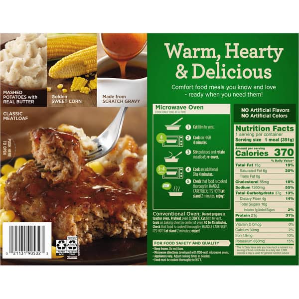 Microwave Oven (Cook only one at a time): 1: Cut film to vent. 2: Cook on high 4 minutes. 3: Stir potatoes and rotate meatloaf; re-cover. 4: Cook an additional 3 to 4 minutes. 5: Check that food is cooked thoroughly. Handle carefully; it’s hot! Let stand 2 minutes; enjoy! Conventional Oven: Do not prepare in toaster oven. Preheat oven to 350 degrees F. Cut film to vent. Cook on baking sheet in center of oven 40 to 45 minutes. Check that food is cooked thoroughly. Handle carefully; it’s hot! Let stand 2 minutes; enjoy! For Food Safety and Quality: Keep frozen. Do not thaw. Microwave directions developed with 1100-watt microwave ovens. Appliances vary. Adjust cooking times as needed. Food must be cooked thoroughly to 165 degrees F.