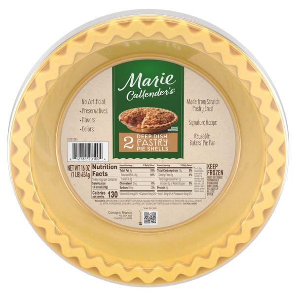 Start your next great pie with Marie Callender’s Pastry Pie Shells. Save time and create your own delicious pies at home with these ready-made pie shells. Made from scratch, these pastry shells are a great foundation to any apple pie, pecan pie, lemon meringue, and more. Reuse the baker’s pie pan for additional baked desserts. Each pack comes with two pie shells, enough to craft plenty of pie for friends and family to enjoy. This box contains two 8-ounce (227g) pastry shells with 16 total recommended servings of 130 calories and 0g of trans fat each. These pastry shells contain wheat. Enjoy the combination of quality ingredients and the love and care baked into Marie Callender’s recipes for the comforting taste of delicious, homemade goodness.
