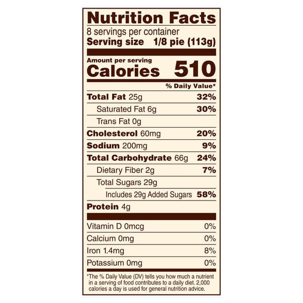 Filling: Corn Syrup, Sugar, Eggs, Pecans, Liquid And Hydrogenated Soybean Oil, Water, Salt, Sunflower Lecithin, Natural Flavors, Beta Carotene (color). Crust: Enriched Wheat Flour (wheat Flour, Niacin, Reduced Iron, Thiamine Mononitrate, Riboflavin, Folic Acid), Palm Oil, Water, Soybean Oil, Dextrose, Salt, Dough Conditioner (sodium Metabisulfite).