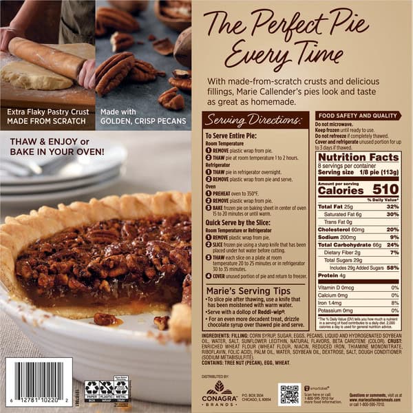 Easy prep. Thaw & enjoy! Extra flaky pastry crust made from scratch. Thaw & enjoy or bake in your oven! The Perfect Pie Everytime: With made-from-scratch crusts and delicious fillings, Marie Callender’s pies look and taste as great as homemade.