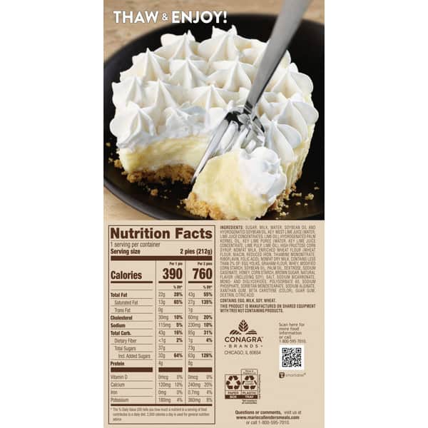 Treat yourself to the perfect comfort food after a long day with Marie Callender’s Key Lime Mini Pies. Each of these boxes includes two 3.75 oz. decadent mini pies that are crafted from creamy key lime filling made with zesty lime juice, paired with a graham cracker crumb crust and finished with whipped topping. Each of these Marie Callender’s desserts is the perfect size for you to enjoy or share with friends. Conveniently prepare the perfect dessert without having to touch your oven. Just remove the plastic and thaw each of these pies in the microwave or refrigerator, or at room temp, for a ready to eat delicious treat.