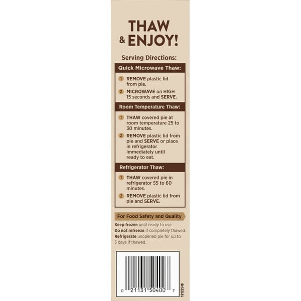 Serving Directions: Quick Microwave Thaw: 1. Remove plastic lid from pie. 2. Microwave on high 15 seconds and serve. Room Temperature Thaw: 1. Thaw covered pie at room temperature 25 to 30 minutes. 2. Remove plastic lid from pie and serve or place in refrigerator immediately until ready to eat. Refrigerator Thaw: 1. Thaw covered pie in refrigerator 55 to 60 minutes. 2. Remove plastic lid from pie and serve. For Food Safety and Quality: Keep frozen until ready to use. Do not refreeze if completely thawed. Refrigerate unopened pie for up to 3 days if thawed.