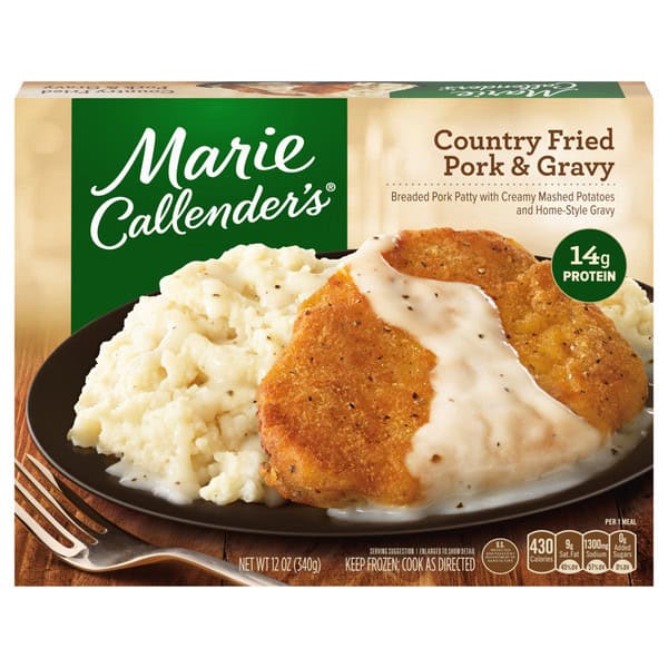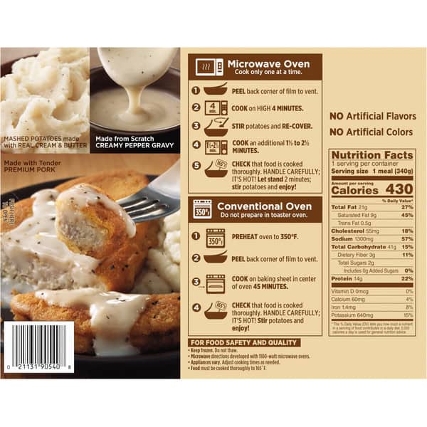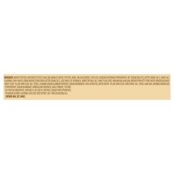 Mashed Potatoes (rehydrated Potato Flakes And Granules [water, Potatoes, Mono- And Diglycerides, Citric Acid, Disodium Dihydrogen Pyrophosphate, Bht, Sodium Bisulfite], Butter [cream, Salt], Cream, Salt, Flavoring), Gravy (water, Cream, Modified Corn Starch, Butter [cream, Salt], Less Than 2% Of: Soybean Oil, Nonfat Dry Milk, Salt, Wheat Flour, Spice, Xanthan Gum, Guar Gum), Breaded Pork Patty (pork, Water, Breader |bleached Wheat Flour, Yellow Corn Flour, Salt, Spices, Leavening (sodium Aluminum Phosphate, Sodium Bicarbonate), Spice Extractive], Batter [water, Yellow Corn Flour, Corn Starch, Salt, Spices, Guar Gum, Leavening (sodium Acid Pyrophosphate, Sodium Bicarbonate, Monocalcium Phosphate), Garlic Powder], Textured Soy Protein Concentrate, Contains 2% Or Less Of: Dextrose, Sodium Tripolyphosphate, Potassium Chloride, Flavoring, Autolyzed Yeast Extract, Salt. Fried In Vegetable Oil).