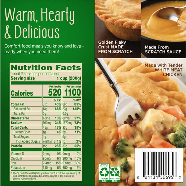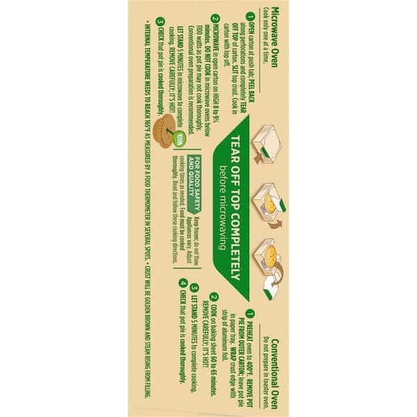 Microwave Oven: Cook only one at a time. 1. Open carton at push tab; peel back along perforations and completely tear off top of carton. Slit top crust. Cook in carton with top off. 2. Microwave in open carton on high 8 to 9-1/2 minutes. Do not cook in microwave ovens below 1100 watts as pot pie may not cook thoroughly. Conventional oven preparation is recommended. Let stand 5 minutes in microwave to complete cooking. Remove carefully; it’s hot! 3. Check that pot pie is cooked thoroughly. Internal temperature needs to reach 165 degrees F as measured by a food thermometer in several spots. Crust is golden brown and steam rises from filling. Tear off top completely before microwaving. Conventional Oven: Do not prepare in toaster oven. 1. Preheat oven to 400 degrees F. Remove pot pie from outer carton; leave pot pie in paper tray. Wrap crust edge with strip of aluminum foil. 2. Cook on baking sheet 60 to 65 minutes. Remove carefully; it’s hot! 3. Let stand 5 minutes to complete cooking. 4. Check that pot pie is cooked thoroughly. Food Safety and Quality: Keep frozen; do not thaw. Appliances vary. Adjust cooking times as needed. Food must be cooked thoroughly. Read and follow these cooking directions.