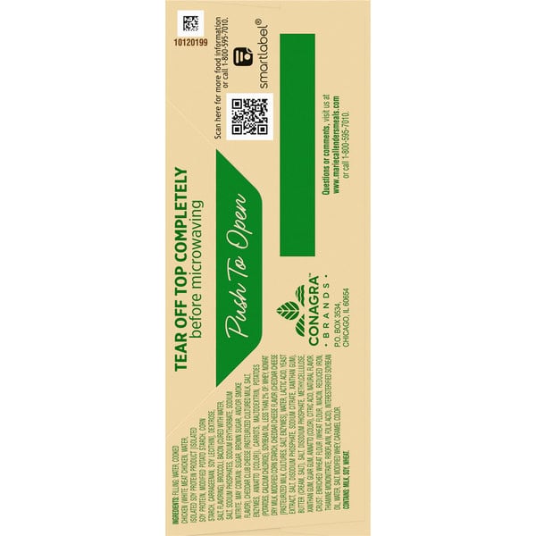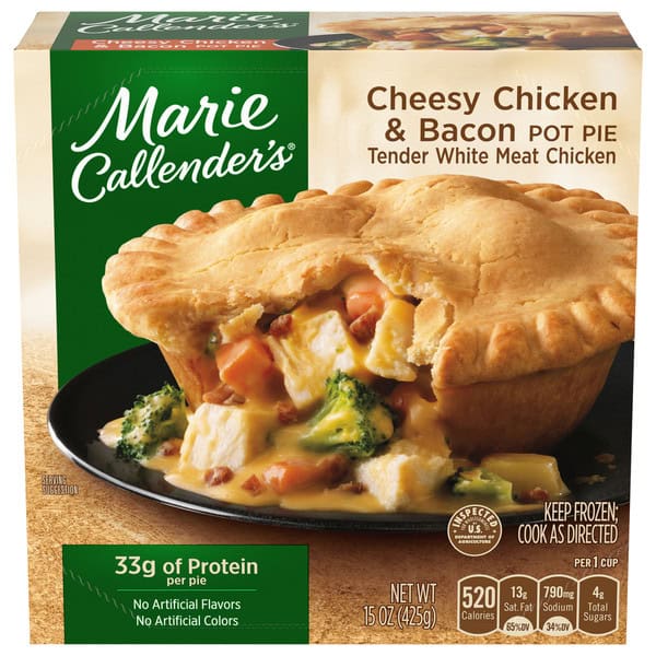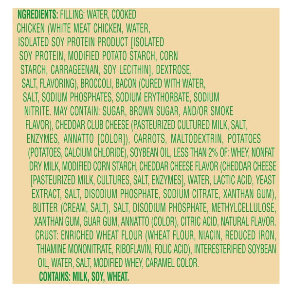 Filling: Water, Cooked Chicken (white Meat Chicken, Water, Isolated Soy Protein Product [isolated Soy Protein, Modified Potato Starch, Corn Starch, Carrageenan, Soy Lecithin], Dextrose, Salt, Flavoring), Broccoli, Bacon (cured With Water, Salt, Sodium Phosphates, Sodium Erythorbate, Sodium Nitrite. May Contain: Sugar, Brown Sugar, And/or Smoke Flavor), Cheddar Club Cheese (pasteurized Cultured Milk, Salt, Enzymes, Annatto [color]), Carrots, Maltodextrin, Potatoes (potatoes, Calcium Chloride), Soybean Oil, Less Than 2% Of: Whey, Nonfat Dry Milk, Modified Corn Starch, Cheddar Cheese Flavor (cheddar Cheese [pasteurized Milk, Cultures, Salt, Enzymes], Water, Lactic Acid, Yeast Extract, Salt, Disodium Phosphate, Sodium Citrate, Xanthan Gum), Butter (cream, Salt), Salt, Potassium Citrate, Methylcellulose, Xanthan Gum, Guar Gum, Annatto (color), Citric Acid, Natural Flavor. Crust: Enriched Wheat Flour (wheat Flour, Niacin, Reduced Iron, Thiamine Mononitrate, Riboflavin, Folic Acid), Interesterified Soybean Oil, Water, Salt, Modified Whey, Caramel Color.