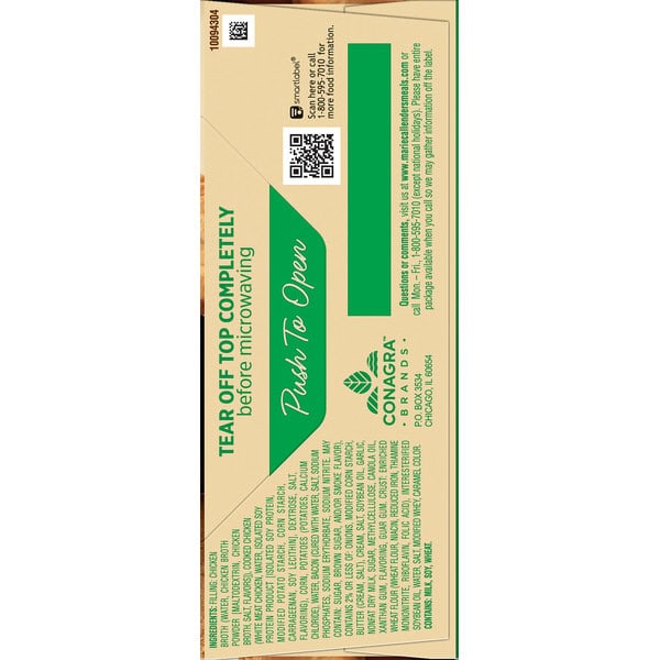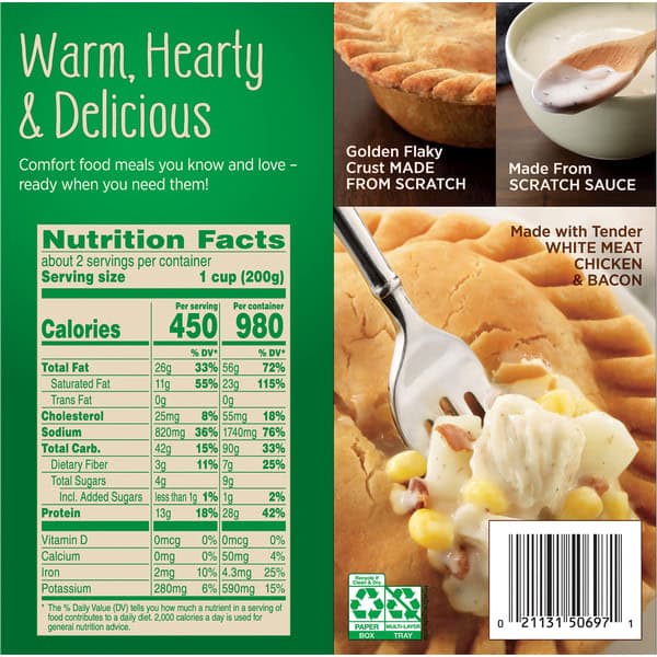 Filling: Chicken Broth (water, Chicken Flavor [chicken Broth, Salt, Chicken Fat]), Cooked Chicken (white Meat Chicken, Water, Isolated Soy Protein Product [isolated Soy Protein, Modified Potato Starch, Corn Starch, Carrageenan, Soy Lecithin], Dextrose, Salt, Flavoring), Corn, Potatoes (potatoes, Calcium Chloride), Water, Bacon (cured With Water, Salt, Sodium Phosphates, Sodium Erythorbate, Sodium Nitrite, May Contain: Sugar, Brown Sugar, And/or Smoke Flavor), Contains 2% Or Less Of: Onions, Modified Corn Starch, Butter (cream, Salt), Cream, Salt, Soybean Oil, Garlic, Nonfat Dry Milk, Sugar, Methylcellulose, Canola Oil, Xanthan Gum, Flavoring, Guar Gum, Crust: Enriched Wheat Flour (wheat Flour, Niacin, Reduced Iron, Thiamine Mononitrate, Riboflavin, Folic Acid), Interesterified Soybean Oil, Water, Salt, Modified Whey, Caramel Color