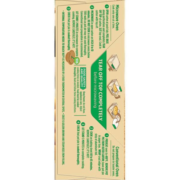 Must be cooked thoroughly. Microwave Oven: Cook only one at a time. 1. Open carton at push tab; peel back along perforations and completely tear off top of carton. Slit top crust. Cook in carton with top off. 2. Microwave in open carton on high 8 to 10 minutes. Do not cook in microwave ovens below 1100 watts as pot pie may not cook thoroughly. Conventional oven preparation is recommended. Let stand 5 minutes in microwave to complete cooking. Remove carefully; it’s hot! 3. Check that pot pie is cooked thoroughly. Internal temperature needs to reach 165 degrees F as measured by a food thermometer in several spots. Crust is golden brown and steam rises from filling. Tear off top completely before microwaving. Conventional Oven: Do not prepare in toaster oven. 1. Preheat oven to 400 degrees F. Remove pot pie from outer carton; leave pot pie in paper tray. Wrap crust edge with strip of aluminum foil. 2. Cook on baking sheet 60 to 65 minutes. Remove carefully; it’s hot! 3. Let stand 5 minutes to complete choking. 4. Check that pot pie is cooked thoroughly. Food Safety and Quality: Keep frozen; do not thaw. Appliances vary. Adjust cooking times as needed. Food must be cooked thoroughly. Read and follow these cooking directions.