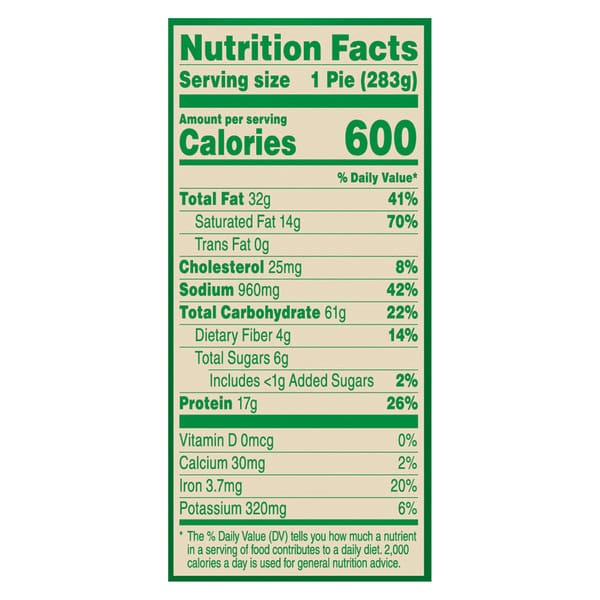 Microwave Oven: Cook only one at a time. 1. Open carton at push tab; peel back along perforations and completely tear off top of carton. Cook in carton with top of. For softer crust, slit top crust before cooking. 2. Microwave in open carton on high 5 to 6-1/2 minutes. Do not cook in microwave ovens below 1100 watts as pot pie may not cook thoroughly. Conventional oven preparation is recommended. Let stand 5 minutes in microwave to complete cooking. Remove carefully; it’s hot! 3. Check that pot pie is cooked thoroughly. Conventional Oven for Flakier Crust: 1. Preheat oven to 400 degrees F. Remove pot pie from outer carton; leave pot pie in paper tray. Wrap crust edge with strip of aluminum foil. 2. Cook on baking sheet 50 minutes. Remove carefully; it’s hot! 3. Let stand 5 minutes to complete cooking. 4. Check that pot pie is cooked thoroughly. Food Safety and Quality: Keep frozen; do not thaw. Appliances vary. Adjust cooking times as needed. Food must be cooked thoroughly. Read and follow these cooking directions. Internal temperature need to reach 165 degrees F as measured by a food thermometer in several spots. Crust is golden brown and steam rises from filling. Do not prepare in toaster oven