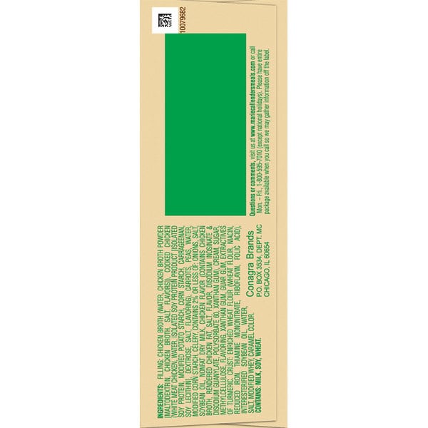Filling: Chicken Broth (water, Chicken Broth Powder [maltodextrin, Chicken Broth, Salt, Flavors]), Cooked Chicken (white Meat Chicken, Water, Isolated Soy Protein Product [isolated Soy Protein, Modified Potato Starch, Corn Starch, Carrageenan, Soy Lecithin], Dextrose, Salt, Flavoring), Carrot Carrots, Peas, Water, Modified Corn Starch, Celery, Contains 2% Or Less Of: Onions, Salt, Soybean Oil, Nonfat Dry Milk, Chicken Flavor (contains Chicken Broth, Rendered Chicken Fat, Salt, Flavor, Disodium Inosinate & Disodium Guanylate, Polysorbate 60, Xanthan Gum), Cream, Sugar, Methylcellulose, Flavoring, Xanthan Gum, Guar Gum, Extractives Of Turmeric, Crust: Enriched Wheat Flour (wheat Flour, Niacin, Reduced Iron, Thiamine Mononitrate, Riboflavin, Folic Acid), Interesterified Soybean Oil, Water, Salt, Modified Whey, Caramel Color.