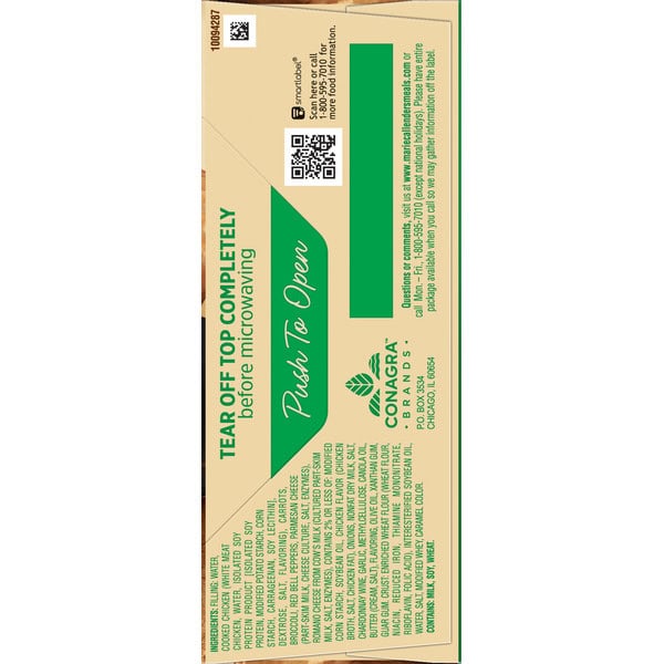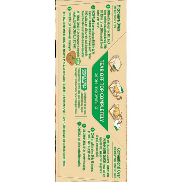 Tear off top completely before microwaving. Food Safety and Quality: Keep frozen; do not thaw. Appliances vary. Adjust cooking times as needed. Food must be cooked thoroughly. Read and follow these cooking directions. Microwave Oven: Cook only one at a time. 1. Open carton at push tab; peel back along perforations and completely tear off top of carton. Slit top crust. Cook in carton with top off. 2. Microwave in open carton on high 8 1/2 to 10 minutes. Do not cook in microwave ovens below 1100 watts as pot pie may not cook thoroughly. Conventional oven preparation is recommended. Let stand 5 minutes in microwave to complete cooking. Remove carefully; it’s hot! 3. Check that pot pie is cooked thoroughly. Conventional Oven: Do not prepare in toaster oven. 1. Preheat oven to 400 degrees F. Remove pot pie from outer cartoon; leave pot pie in paper tray. Wrap crust edge with strip of aluminum foil. 2. Cook on baking sheet 60 to 65 minutes. Remove carefully; it’s hot! 3. Let stand 5 minutes to complete cooking. 4. Check that pot pie is cooked thoroughly. Internal temperature needs to reach 165 degrees F as measured by a food thermometer in several spots. Crust is golden brown and steam rises from filling.