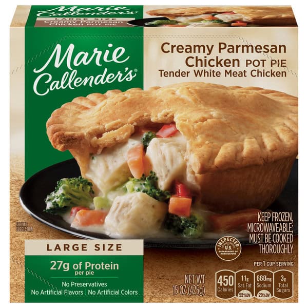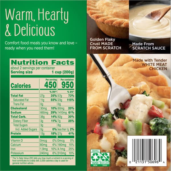 No preservatives. No artificial colors. Microwavable. Must be cooked thoroughly. Warm, hearty & delicious. Comfort food meals you know and love – ready when you need them! Golden flaky crust made from scratch. Made from scratch sauce.