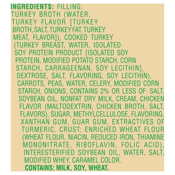 Filling: Turkey Broth (water, Turkey Flavor [turkey Broth, Salt, Turkey Fat, Turkey Meat, Flavor]), Cooked Turkey (turkey Breast, Water, Isolated Soy Protein Product [isolated Soy Protein, Modified Potato Starch, Corn Starch, Carrageenan, Soy Lecithin], Dextrose, Salt, Flavoring, Soy Lecithin), Carrots, Peas, Water, Celery, Modified Corn Starch, Onions, Contains 2% Or Less Of: Salt, Soybean Oil, Nonfat Dry Milk, Cream, Chicken Flavor (maltodextrin, Chicken Broth, Salt, Flavors), Sugar, Methylcellulose, Flavoring, Xanthan Gum, Guar Gum, Extractives Of Turmeric. Crust: Enriched Wheat Flour (wheat Flour, Niacin, Reduced Iron, Thiamine Mononitrate, Riboflavin, Folic Acid), Interesterified Soybean Oil, Water, Salt, Modified Whey, Caramel Color.