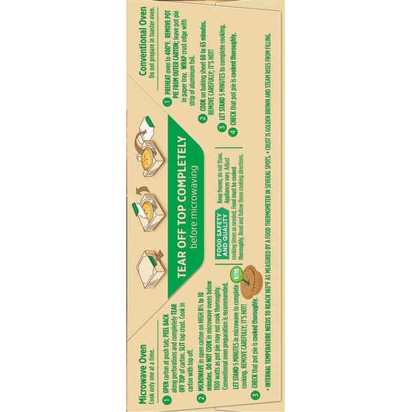 Tear off top completely before microwaving. Microwave Oven: Cook only one at a time. 1. Open carton at push tab; peel back along perforations and completely tear off top of carton. Slit top crust. Cook in carton with top off. 2. Microwave in open carton on high 8 1/2 to 10 minutes. Do not cook in microwave ovens below 1100 watts as pot pie may not cook thoroughly. Conventional oven preparation is recommended. Let stand 5 minutes in microwave to complete cooking. Remove carefully; it’s hot! 3. Check that pot pie is cooked thoroughly. Conventional Oven: Do not prepare in toaster oven. 1. Preheat oven to 400 degrees F. Remove pot pie from outer cartoon; leave pot pie in paper tray. Wrap crust edge with strip of aluminum foil. 2.Cook on baking sheet 60 to 65 minutes. Remove carefully; it’s hot! 3. Let stand 5 minutes to complete cooking. 4. Check that pot pie is cooked thoroughly. Food Safety and Quality: Keep frozen; do not thaw. Appliances vary. Adjust cooking times as needed. Food must be cooked thoroughly. Read and follow these cooking directions. Internal temperature needs to reach 165 degrees F as measured by a food thermometer in several spots. Crust is golden brown and steam rises from filling.