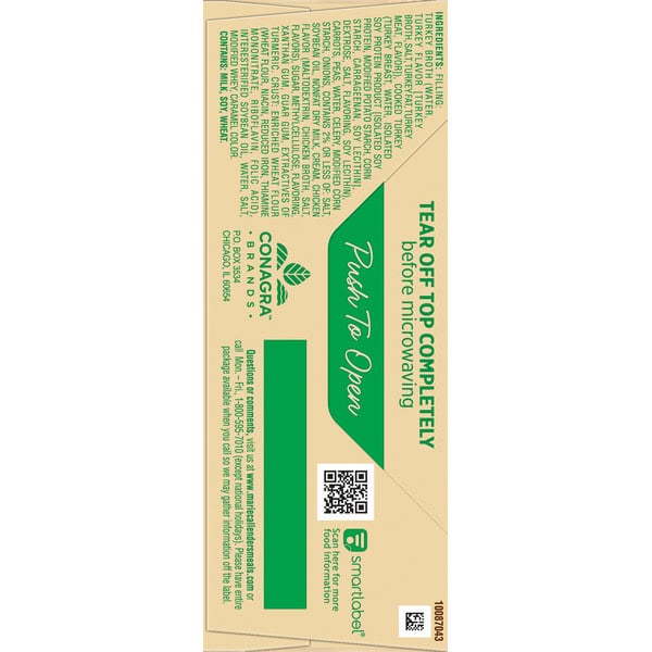 Premium turkey breast. No preservatives. No artificial colors. Microwaveable; must be cooked thoroughly. Warm, hearty & delicious. Comfort food meals you know and love – ready when you need them!