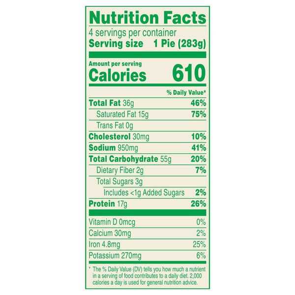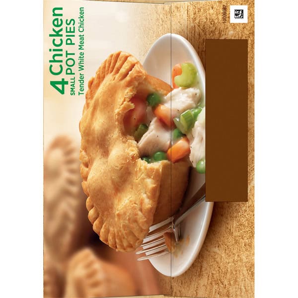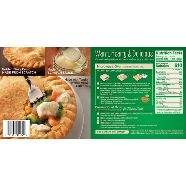 Must be cooked thoroughly. Microwave Oven (Cook only one at a time): Tear off top completely (before microwaving): 1: Open carton at push tab; peel back along perforations and completely tear off top of carton. Cook in carton with top off. For softer crust, slit top crust before cooking. 2: Microwave in open carton on high 5 to 6-1/2 minutes. Do not cook in microwave ovens below 1100 watts as pot pie may not cook thoroughly. Conventional oven preparation is recommended. Let stand 5 minutes in microwave to complete cooking. Remove carefully; it’s hot! 3: Check that pot pie is cooked thoroughly. Internal temperature needs to reach 165 degrees F as measured by a food thermometer in several spots. Crust will be golden brown and steam rising from filling. Conventional Oven for Flakier Crust (Do not prepare in toaster oven): 1: Preheat oven to 400 degrees F. Remove pot pie from outer carton; leave pot pie in paper tray. Wrap crust edge with strip of aluminum foil. 2: Cook on baking sheet 50 minutes. Remove carefully; it’s hot! 3: Let stand 5 minutes to complete cooking. 4: Check that pot pie is cooked thoroughly. Internal temperature needs to reach 165 degrees F as measured by a food thermometer in several spots. Crust will be golden brown and steam rising from filling. Food Safety and Quality: Keep frozen; do not thaw. Appliances vary. Adjust cooking times as needed. Food must be cooked thoroughly. Read and follow these cooking directions.
