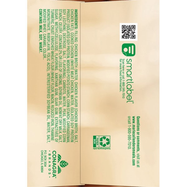 Filling: Chicken Broth (water, Chicken Flavor [chicken Broth, Salt, Chicken Fat]), Cooked Chicken (white Meat Chicken, Water, Isolated Soy Protein Product [isolated Soy Protein, Modified Potato Starch, Corn Starch, Carrageenan, Soy Lecithin], Dextrose, Salt, Flavoring), Carrots, Water, Peas, Modified Corn Starch, Celery, Contains 2% Or Less Of: Onions, Soybean Oil, Nonfat Dry Milk, Salt, Sugar, Methylcellulose, Flavoring, Xanthan Gum, Guar Gum, Extractives Of Turmeric. Crust: Enriched Wheat Flour (wheat Flour, Niacin, Reduced Iron, Thiamine Mononitrate, Riboflavin, Folic Acid), Interesterified Soybean Oil, Water, Salt, Modified Whey, Caramel Color..