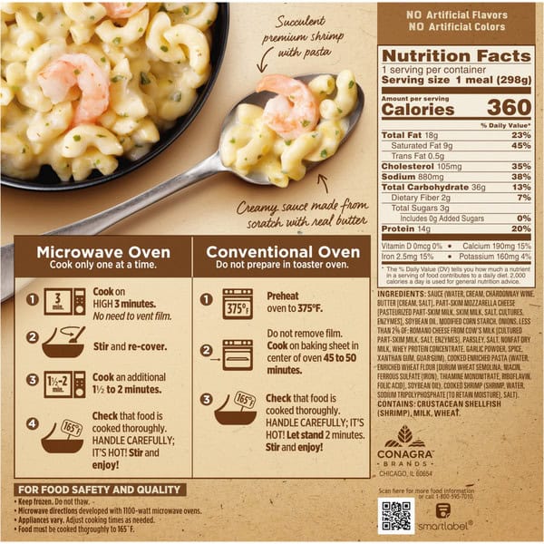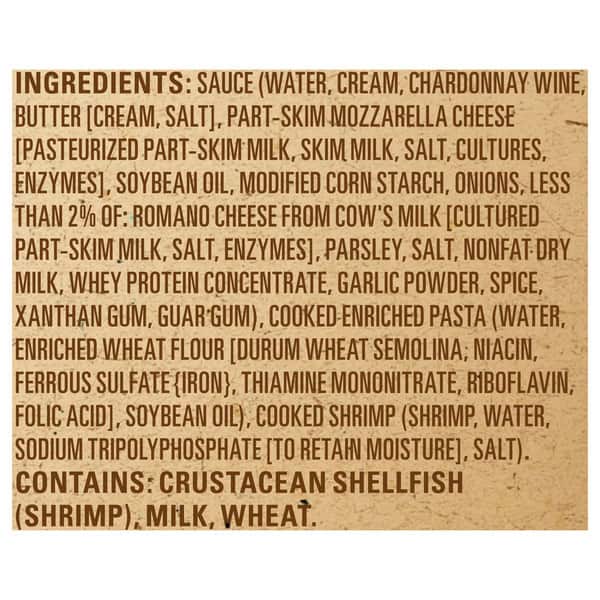 Sauce (water, Cream, Chardonnay Wine, Butter [cream, Salt], Part-skim Mozzarella Cheese [pasteurized Part-skim Milk, Skim Milk, Salt, Cultures, Enzymes], Soybean Oil, Modified Corn Starch, Onions, Less Than 2% Of: Romano Cheese From Cow’s Milk [cultured Part-skim Milk, Salt, Enzymes], Parsley, Salt, Nonfat Dry Milk, Whey Protein Concentrate, Garlic Powder, Spice, Xanthan Gum, Guar Gum), Cooked Enriched Pasta (water, Enriched Wheat Flour [durum Wheat Semolina, Niacin, Ferrous Sulfate {iron}, Thiamine Mononitrate, Riboflavin, Folic Acid], Soybean Oil), Cooked Shrimp (shrimp, Water, Sodium Tripolyphosphate [to Retain Moisture], Salt)