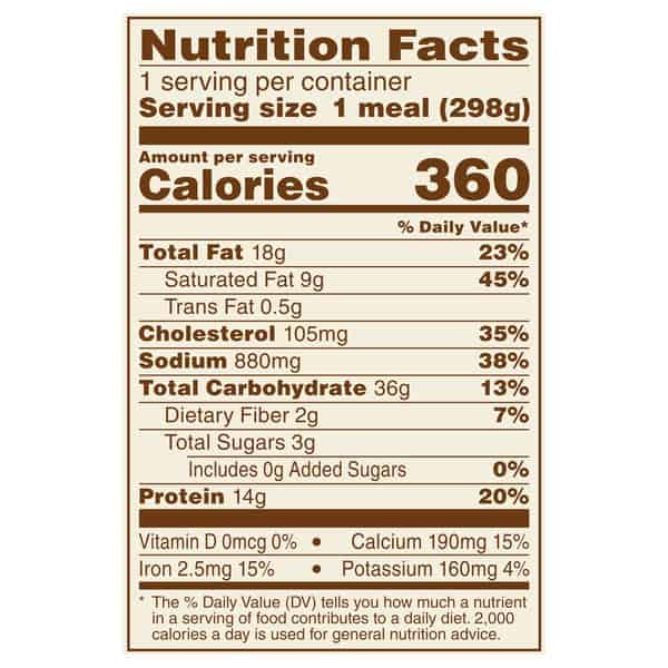 Microwave Oven: Cook only one at a time. 1. Cook on high 3 minutes. No need to vent film. 2. Stir and re-cover. 3. Cook an additional 1-1/2 to 2 minutes. 4. Check that food is cooked thoroughly. Handle carefully; It’s hot! Stir and enjoy! Conventional Oven: Do not prepare in toaster oven. 1. Preheat oven to 375 degrees F. 2. Do not remove film. Cook on baking sheet in center of oven 45 to 50 minutes. 3. Check that food is cooked thoroughly. Handle carefully; It’s hot! Let stand 2 minutes. Stir and enjoy! For Food Safety and Quality: Keep frozen. Do not thaw. Microwave directions developed with 1100-watt microwave ovens. Appliances vary. Adjust cooking times as needed. Food must be cooked thoroughly to 165 degrees F.