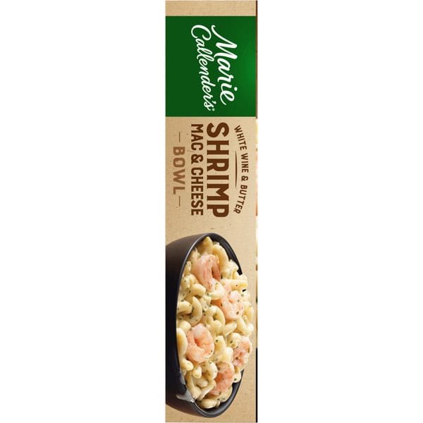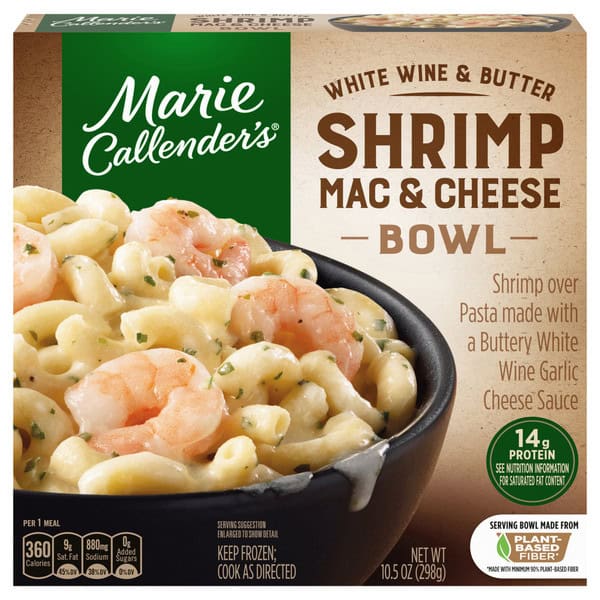 Shrimp over pasta made with a buttery white wine garlic cheese sauce. White wine & butter. A big bowl of delicious succulent premium shrimp with pasta. Creamy sauce made from scratch with real butter. No artificial colors. Serving bowl made from plant-based fiber. We love our planet as much as we love our food. Marie Callender’s bowls use a serving bowl made from plant based fiber – which helps us avoid using on average 3 millions pounds of plastic every year.