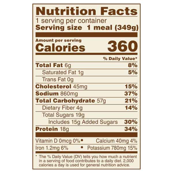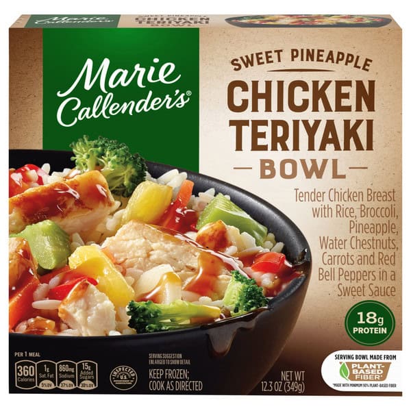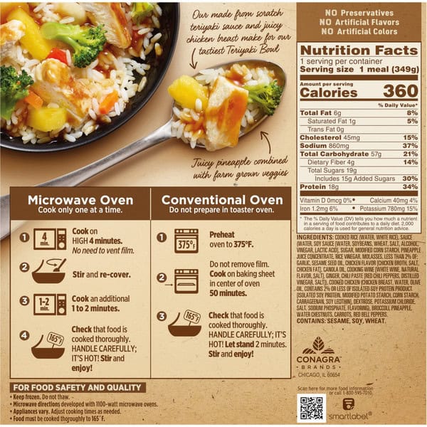 Cooked Rice (water, White Rice), Sauce (water, Soy Sauce [water, Soybeans, Wheat, Salt, Alcohol, Vinegar, Lactic Acid], Sugar, Modified Corn Starch, Pineapple Juice Concentrate, Rice Vinegar, Molasses, Less Than 2% Of: Garlic, Sesame Seed Oil, Chicken Flavor [chicken Broth, Salt, Chicken Fat], Canola Oil, Cooking Wine [white Wine, Natural Flavor, Salt], Ginger, Chili Paste [red Chili Peppers, Distilled Vinegar, Salt]), Cooked Chicken (chicken Breast, Water, Olive Oil, Contains 2% Or Less Of Isolated Soy Protein.product [isolated Soy Protein, Modified Potato Starch, Corn Starch, Carrageenan, Soy Lecithin], Dextrose, Potassium Chloride, Salt, Sodium Phosphate, Flavoring), Broccoli, Pineapple, Water Chestnuts, Carrots, Red Bell Peppers.