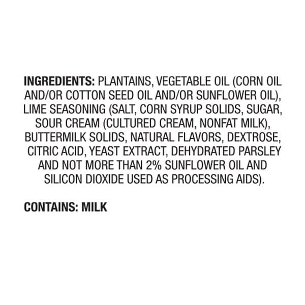 Plantains, Vegetable Oil (Cotton Seed Oil and/or Corn Oil and/or Canola Oil), Garlic Powder and Salt.