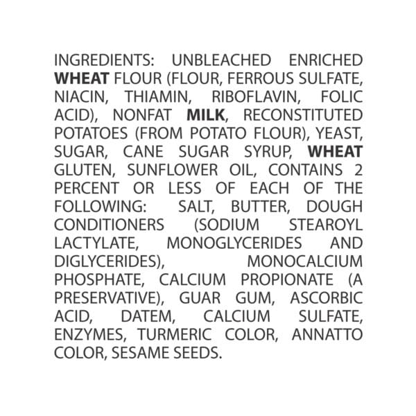 Unbleached Enriched Wheat Flour (Flour, Ferrous Sulfate, Niacin, Thiamin, Riboflavin, Folic Acid), Nonfat Milk, Reconstituted Potatoes (From Potato Flour), Yeast, Sugar, Cane Sugar Syrup, Wheat Gluten, Sunflower Oil, Contains 2 Percent Or Less Of Each Of The Following: Salt, Butter, Dough Conditioners (Sodium Stearoyl Lactylate, Monoglycerides And Diglycerides), Monocalcium Phosphate, Cultured Wheat Flour, Calcium Propionate (A Preservative), Guar Gum, Ascorbic Acid, Datem, Calcium Sulfate, Enzymes, Turmeric Color, Annatto Color, Sesame Seeds.