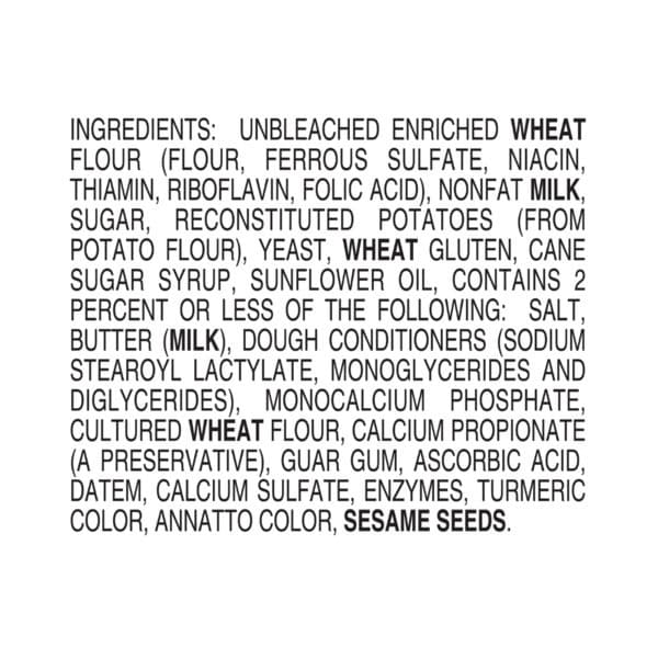 Unbleached Enriched Wheat Flour (Flour, Ferrous Sulfate, Niacin, Thiamin, Riboflavin, Folic Acid), Nonfat Milk, Sugar, Reconstituted Potatoes (From Potato Flour), Yeast, Wheat Gluten, Cane Sugar Syrup, Sunflower Oil, Contains 2 Percent Or Less Of The Following: Salt, Butter (Milk), Dough Conditioners (Sodium Stearoyl Lactylate, Monoglycerides And Diglycerides), Monocalcium Phosphate, Cultured Wheat Flour, Calcium Propionate (A Preservative), Guar Gum, Ascorbic Acid, Datem, Calcium Sulfate, Enzymes, Turmeric Color, Annatto Color, Sesame Seeds.