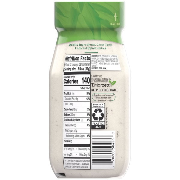 Get back to loving the food you eat, using products with ingredients you can trust. Made with real buttermilk, Marzetti Classic Ranch Dressing and Dip is a creamy, smooth recipe that pairs well with all your favorite foods. Crafted using high-quality ingredients to deliver authentic taste without artificial flavors, colors, high-fructose corn syrups, or preservatives.