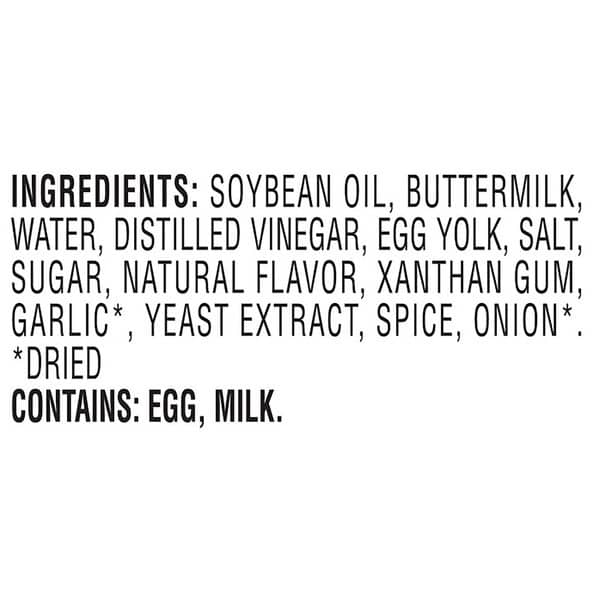 Soybean Oil, Buttermilk, Distilled Vinegar, Egg Yolk, Salt, Sugar, Natural Flavor, Yeast Extract, Garlic*, Xanthan Gum, Spice, Onion*, *dried