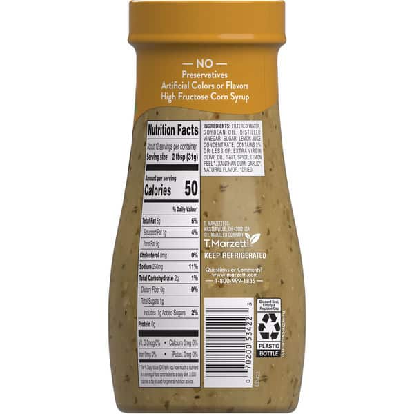 Filtered Water, Soybean Oil, Distilled Vinegar, Sugar, Lemon Juice Concentrate, Extra Virgin Olive Oil, Salt, Spice, Lemon Peel*, Xanthan Gum, Garlic*, Natural Flavor, *dried