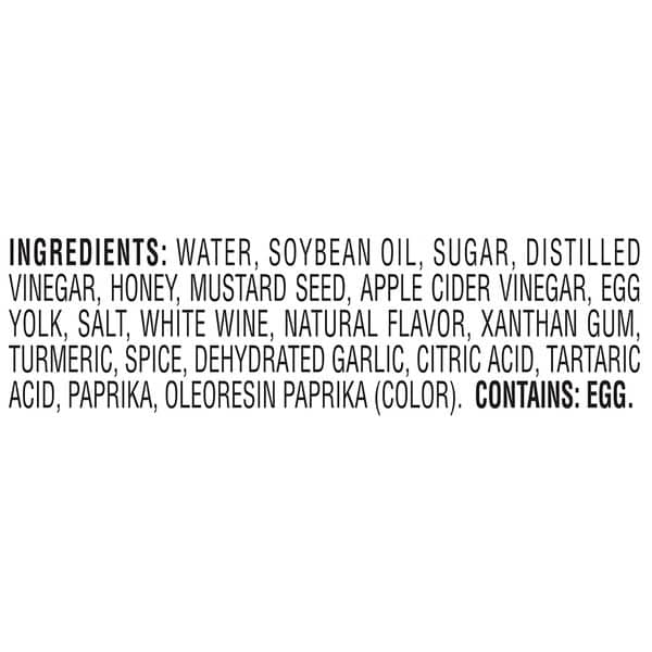 Water, Soybean Oil, Sugar, Distilled Vinegar, Honey, Mustard Seed, Apple Cider Vinegar, Egg Yolk, Salt, White Wine, Natural Flavor, Xanthan Gum, Turmeric, Spice, Dehydrated Garlic, Citric Acid, Tartaric Acid, Paprika, Oleoresin Paprika (color).