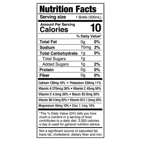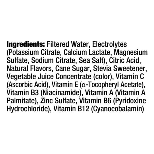 Filtered Water, Electrolytes (Potassium Citrate, Calcium Lactate, Magnesium Sulfate, Sodium Citrate, Sea Salt), Citric Acid, Natural Flavors, Cane Sugar, Stevia Sweetener, Vegetable Juice Concentrate (color), Vitamin C (Ascorbic Acid), Vitamin E (α-Tocopheryl Acetate), Vitamin B3 (Niacinamide), Vitamin A (Vitamin A Palmitate), Zinc Sulfate, Vitamin B6 (Pyridoxine Hydrochloride), Vitamin B12 (Cyanocobalamin).