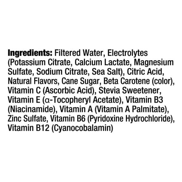 Filtered Water, Electrolytes (potassium Citrate, Calcium Lactate, Magnesium Sulfate, Sodium Citrate, Sea Salt), Citric Acid, Natural Flavors, Cane Sugar, Beta Carotene (color), Vitamin C (ascorbic Acid), Stevia Sweetener, Vitamin E (a-tocopheryl Acetate), Vitamin B3 (niacinamide), Vitamin A (vitamin A Palmitate) Zinc Sulfate, Vitamin B6 (pyridoxine Hydrochloride), Vitamin B12 (cyanocobalamin)