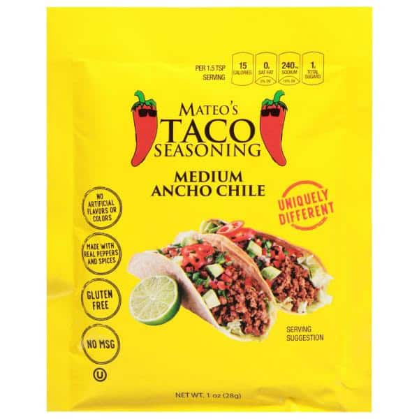 Get Obsessed: 1 lb. ground beef or turkey. 2/3 cup water. 1 packet Mateo’s taco seasoning. Preparation: Brown meat in sautĂ© pan over medium-high heat; drain fat if desired. Stir in seasoning and water. Bring to a boil, reduce heat and simmer 3-5 minutes more or until sauce has thickened.