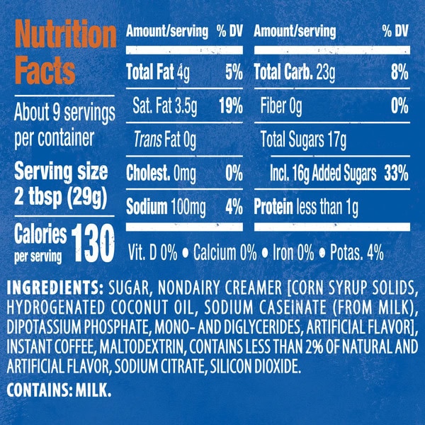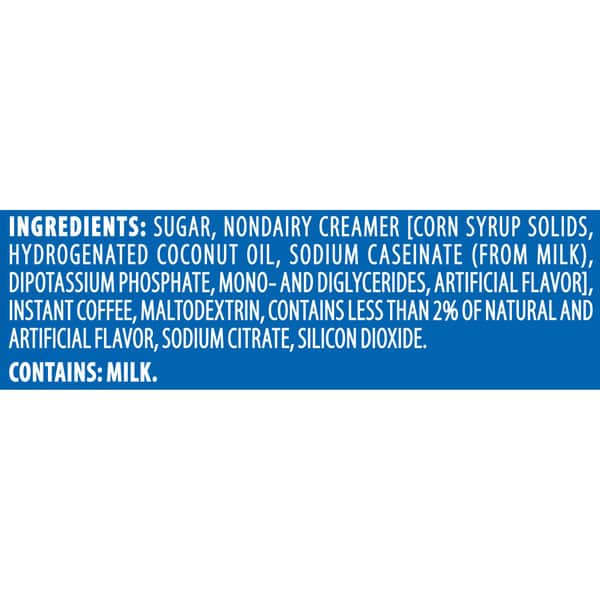 Sugar, Nondairy Creamer [corn Syrup Solids, Hydrogenated Coconut Oil, Sodium Caseinate (from Milk), Dipotassium Phosphate, Mono- And Diglycerides, Artificial Flavor], Instant Coffee, Maltodextrin, Contains Less Than 2% Of Natural And Artificial Flavor, Sodium Citrate, Silicon Dioxide.
